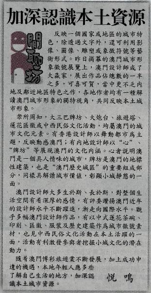 徽號展開幕式昨日下午三時在教科文中心展覽廳舉行,由澳門基金會行政委員會主席吳榮恪、澳門設計師協會會長黃奕輝聯同專程赴澳出席展覽的評委金炫、張武、林宏澤主持剪綵。黃奕輝致詞表示,澳門作為亞洲其中一個最令人熟悉的綜合性旅遊熱點,不論從整體的風格與面貌,或從風土人情與居民的整體價值觀上,均滲透著悠遠而獨特的歷史文化內涵。