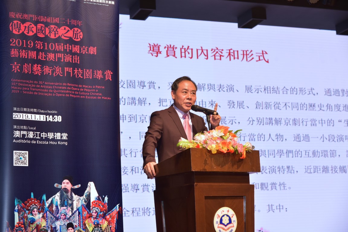 Realizaram-se, respectivamente, às 14h e 17h do dia 11 de Novembro na Escola Hou Kong e Instituto Politécnico de Macau as sessões de ópera de Pequim em escolas. O reitor da Escola de Ópera de Jilin Ni Maocai e o presidente da direcção da Fundação da Ópera de Pequim da China Zhang Jianguo fizeram os respectivos discursos para divulgar este tipo de arte aos alunos, tendo estes, sido convidados a participarem nos espectáculos.