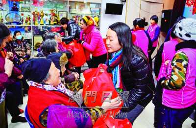 新春佳節即將來臨,婦聯總會在澳門基金會贊助下,今年續向貧困家庭及弱勢群體致送福包,惠及1,457個家庭,派發地點主要為婦聯總會屬下5個服務中心。今次福包內的賀年禮品有螺片、臘腸、油、麵和餅等食品。